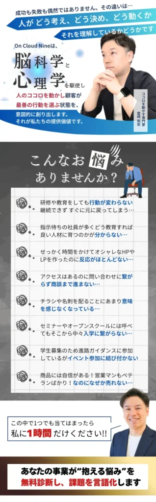 On ClouldNineは 抽象的・感覚的になりがちな成功や失敗のプロセスを「脳科学×心理学」を駆使した独自の研修やサービスにより論理的に整理し、研修・サービス終了後にも継続的に再現可能な課題解決方法を提案します。